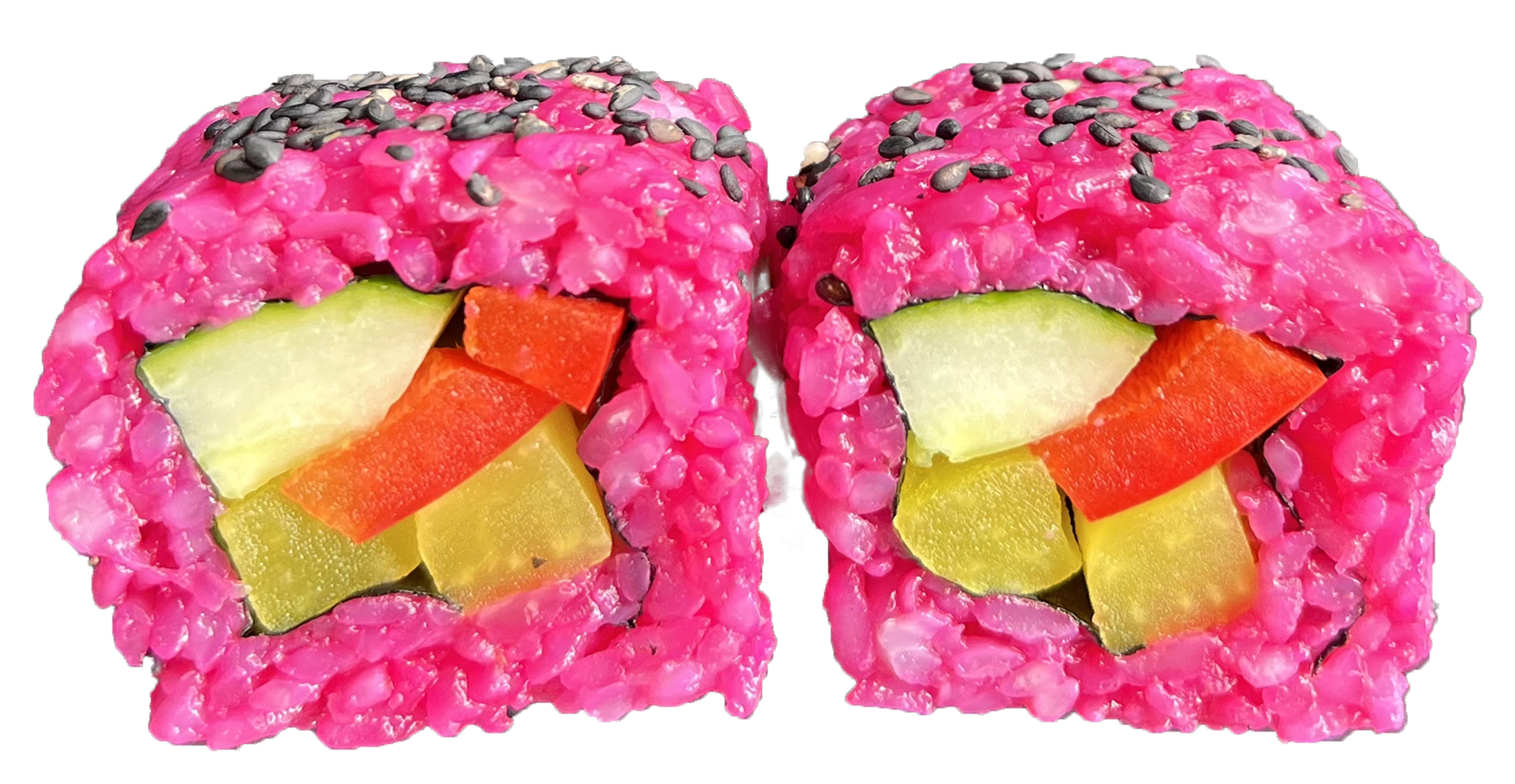 Streifen von Paprika, Gurke und japanischem Rettich ummantelt von pinkem Reis und schwarzem Sesam, 2 Stk.