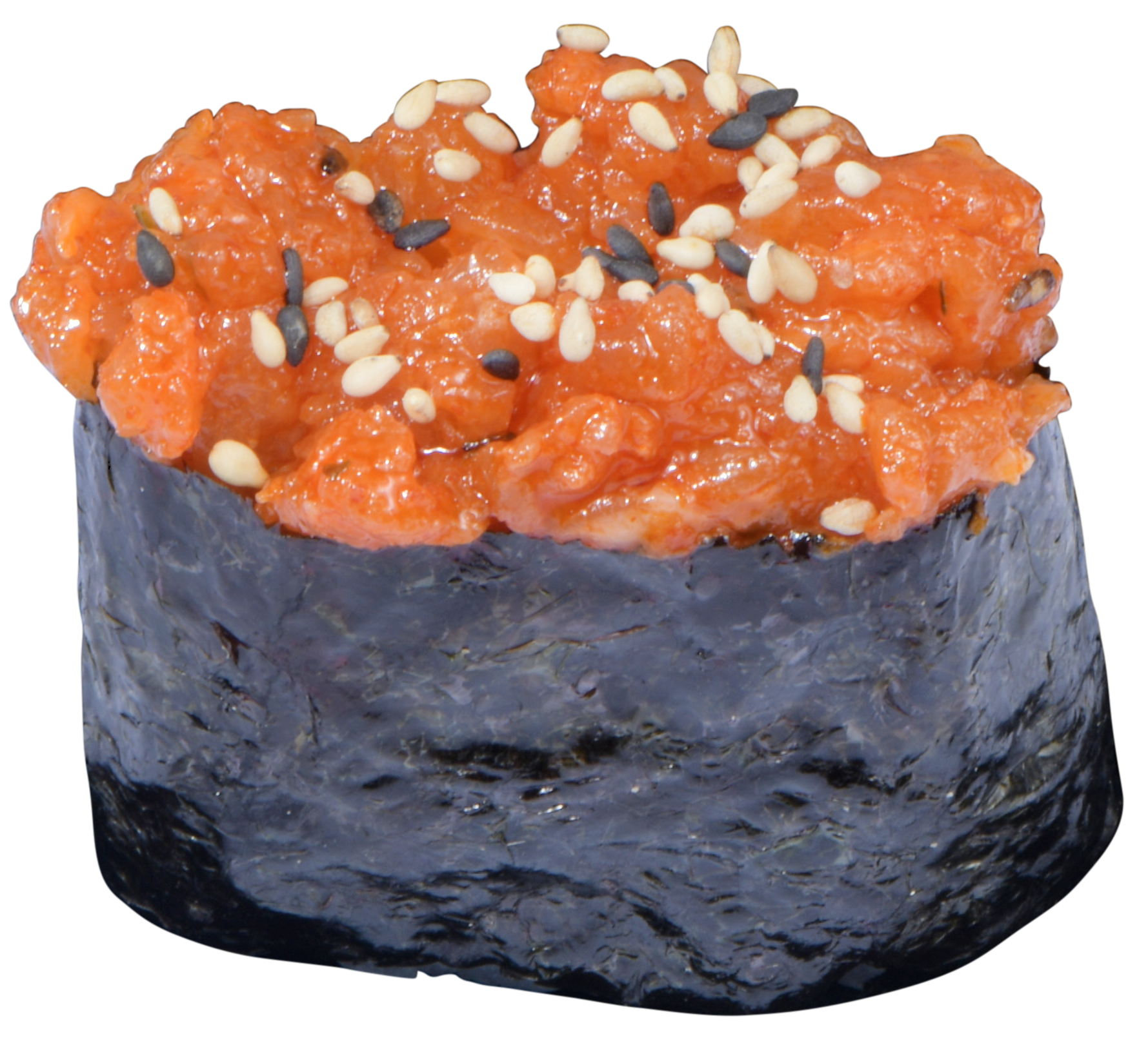 Pikantes Lachstatar auf Reis umhüllt von einem Noriblatt, 1 Stk.