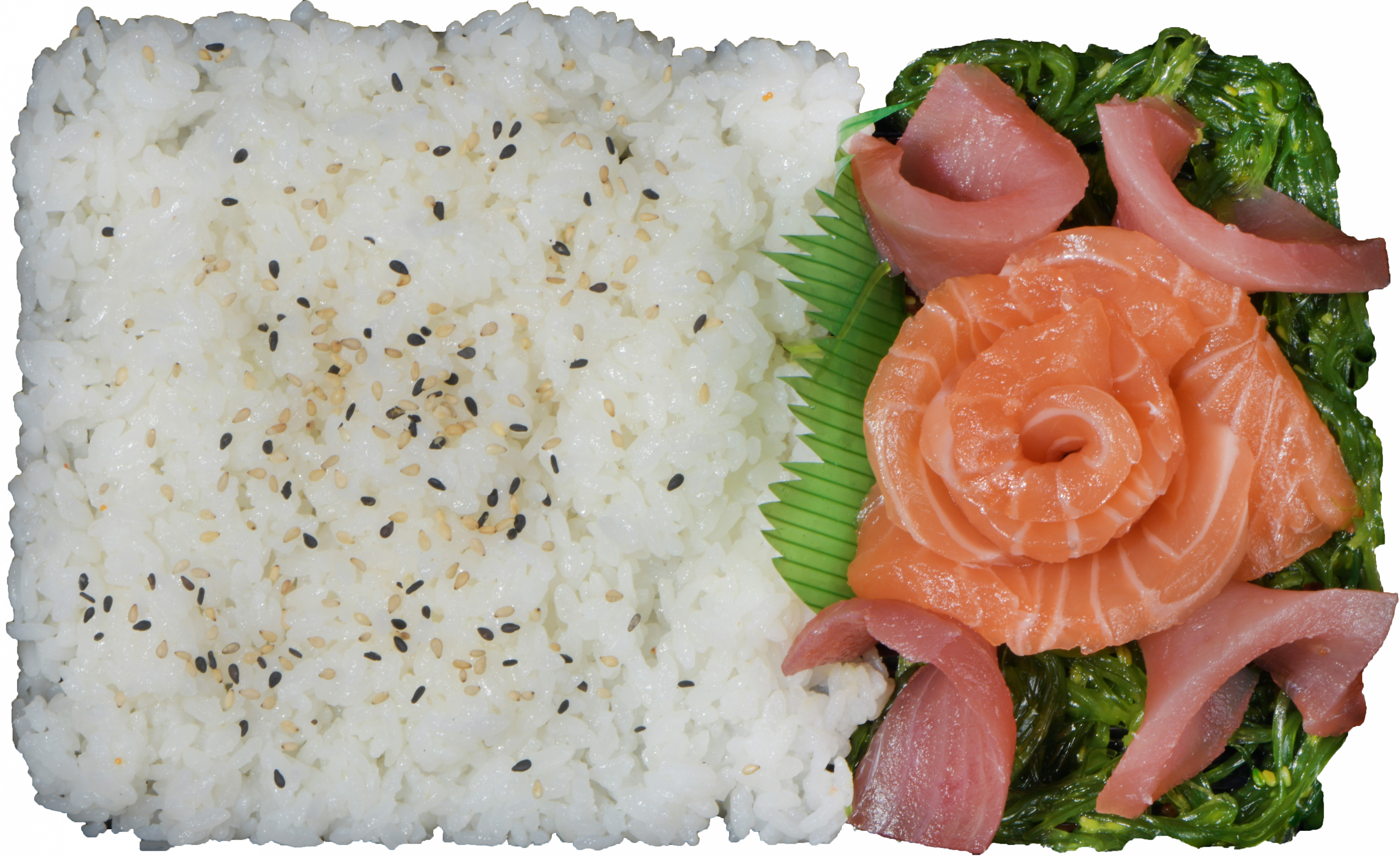 4 Thunfischfiletscheiben, 4 Lachsfiletscheiben mit Portion Reis, Algensalat und Gurken. Sojasauce, Wasabi, Ingwer und Stäbchen mitgeliefert.