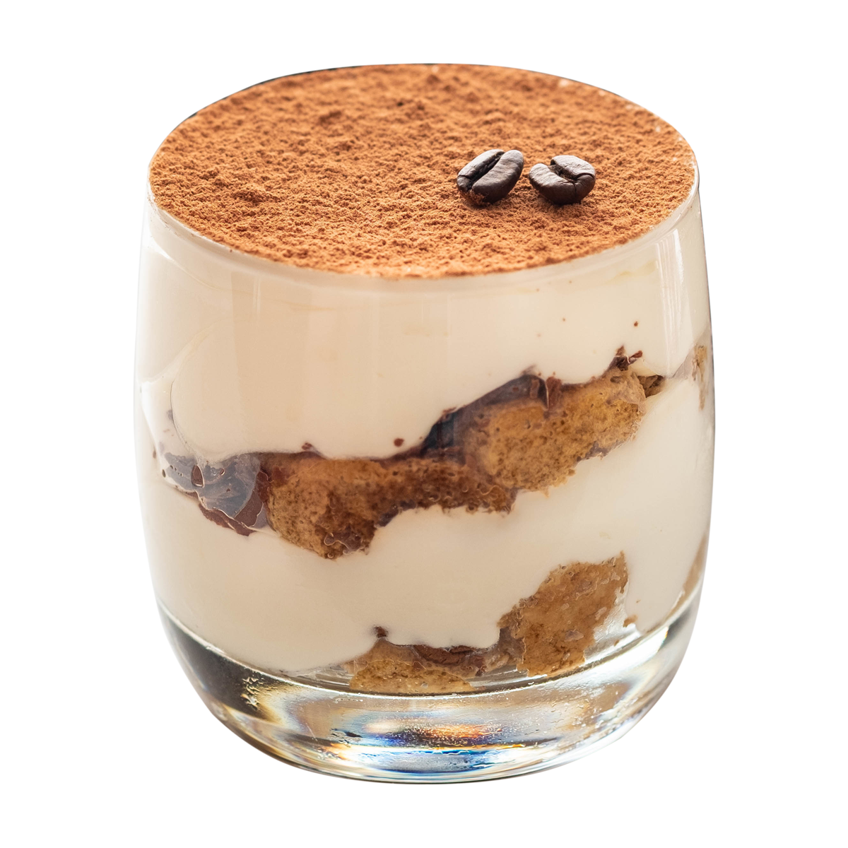 Geschichtetes Dessert aus Creme mit Mascarponefrischkäse, Kaffeesoße, Biskuit und Kakaodekor, 100g im Glas